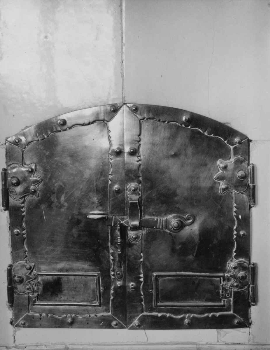 Kakelugnslucka av mässing i övre våningen på Domprostgården.