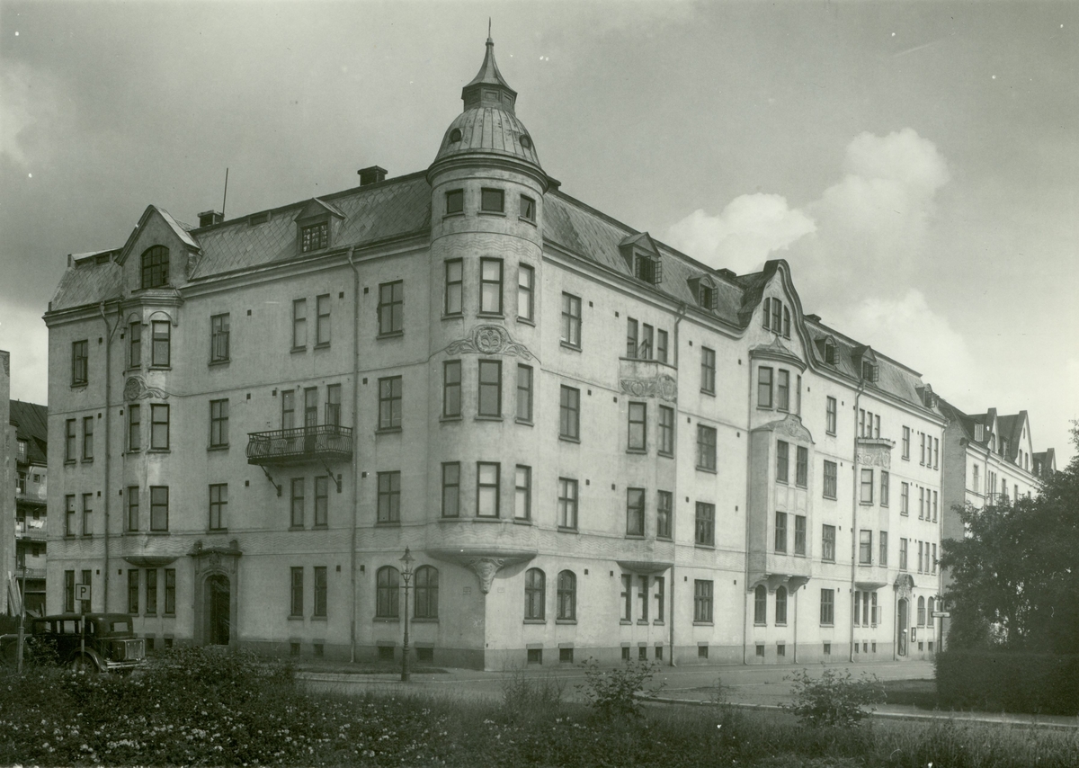 Gamla Stan. Bostadshus med balkong och putsad fasad. Hörnet Vegagatan-Odengatan.