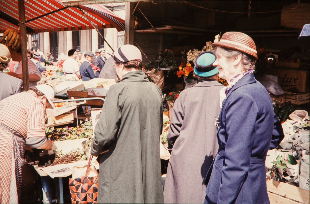 Toghandel i Växjö, 1958. Några kvinnor framför ett marknadsstånd.