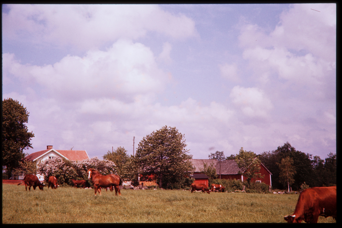 Gård i Nöbbele, 1956. Äng med betande kor och en häst.