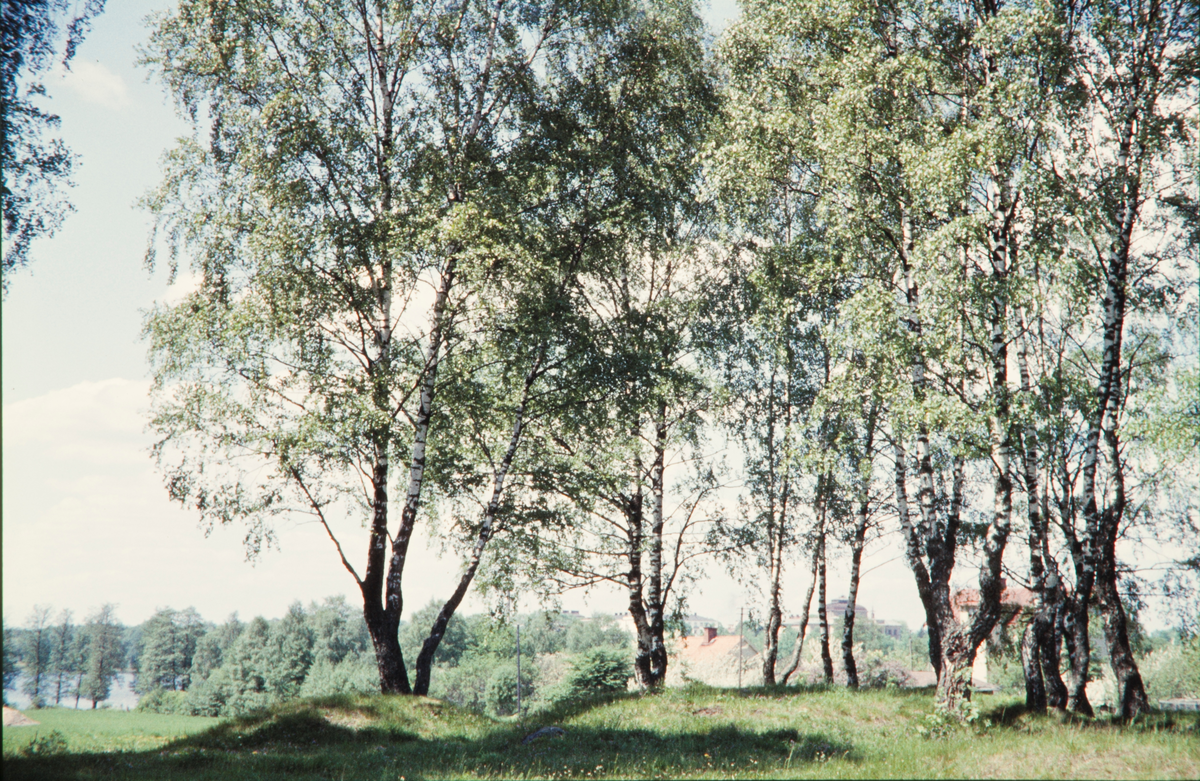 Gravhögar på gravfältet vid Kampen i Växjö, sent 1950-tal. I bakgrunden till vänster skymtar Växjösjön.