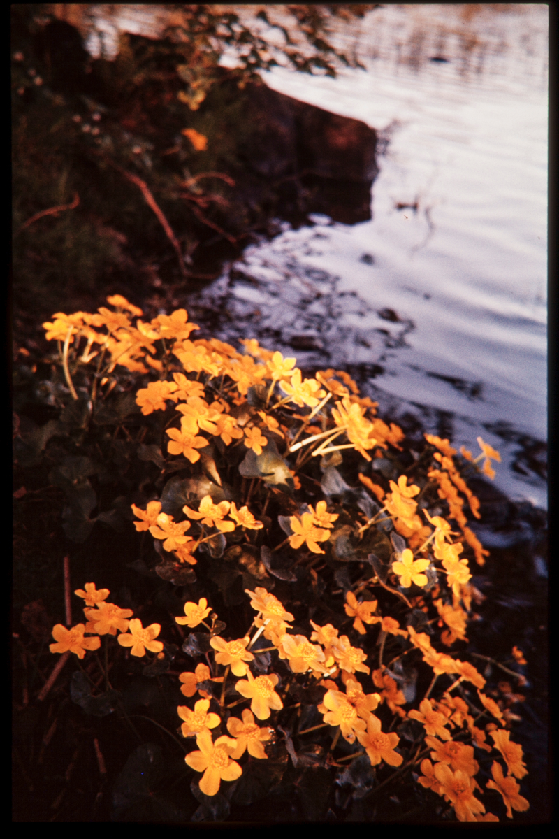 Blommande kabbeleka vid Växjösjöns strandkant. 1956