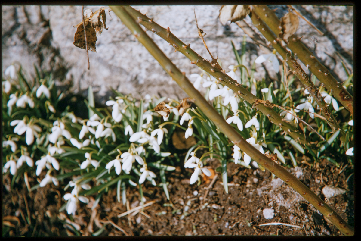 Snödroppar i en rabatt om våren. 1956