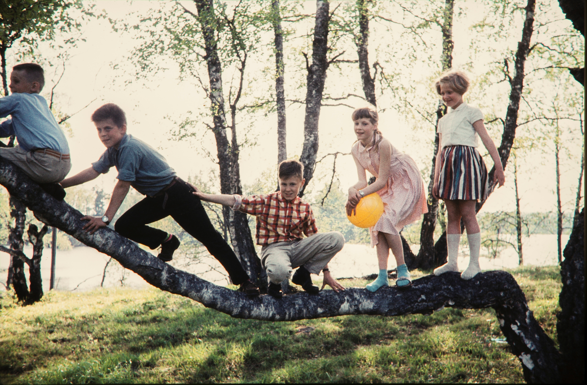 Barn som klättrar i träd. Sjöudden i Växjö. 1958.