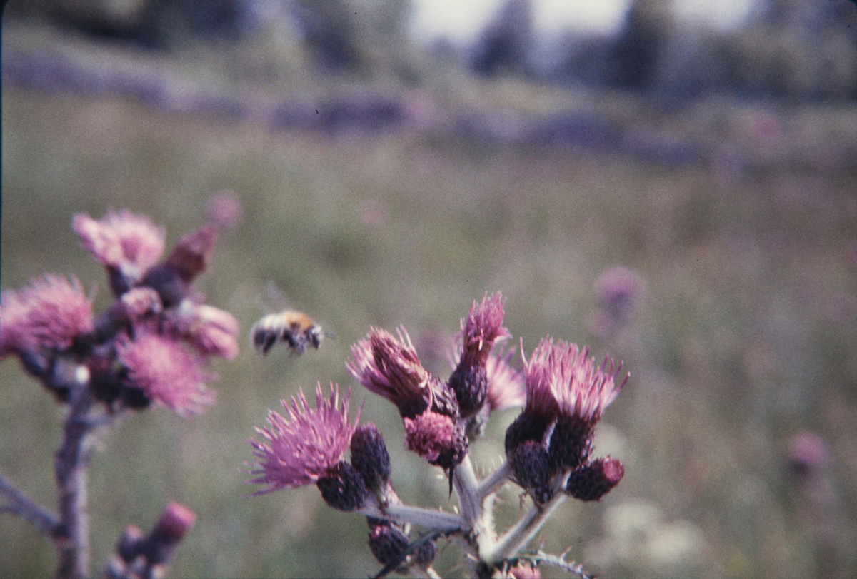 En humla flyger mellan tistelblommor.