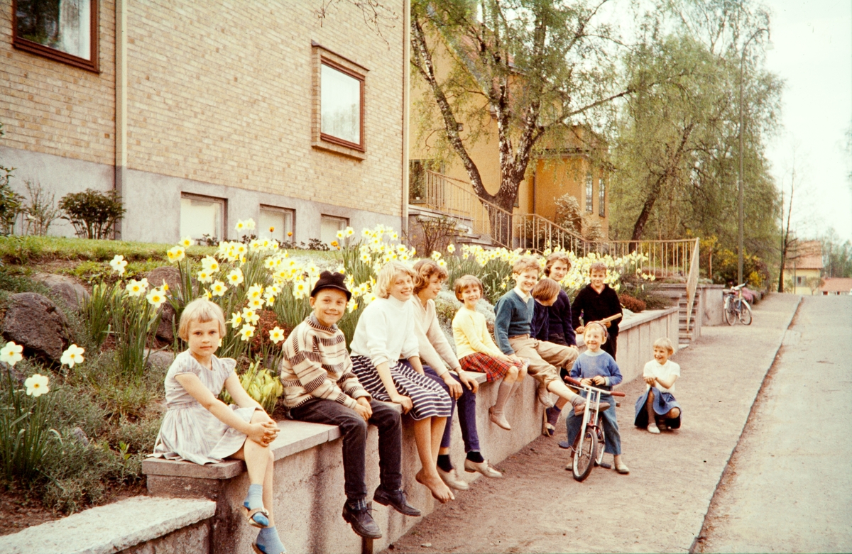 Sittande barn på trädgårdsmur, Väster i Växjö, 1959.