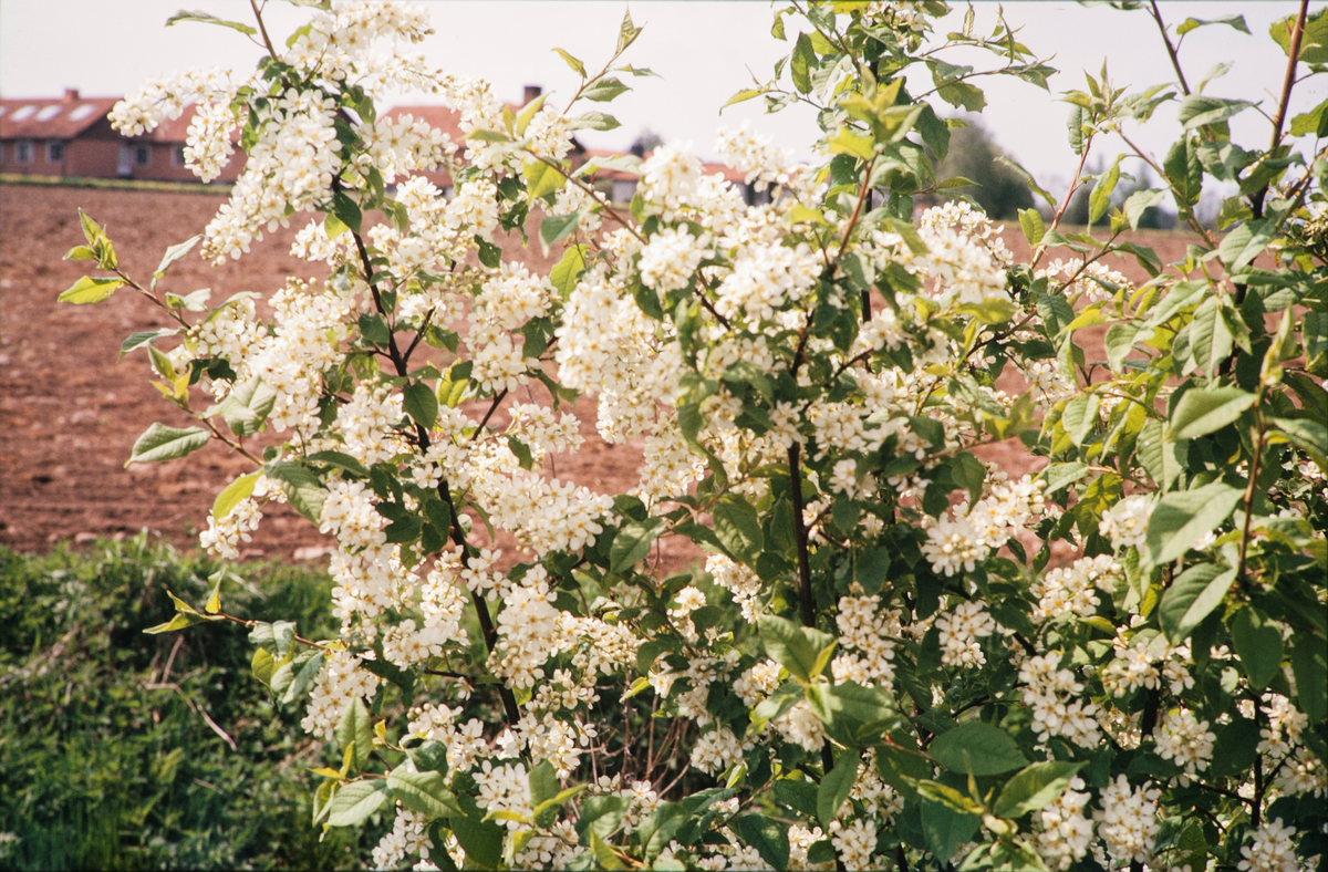 Blommande hägg vid åker.