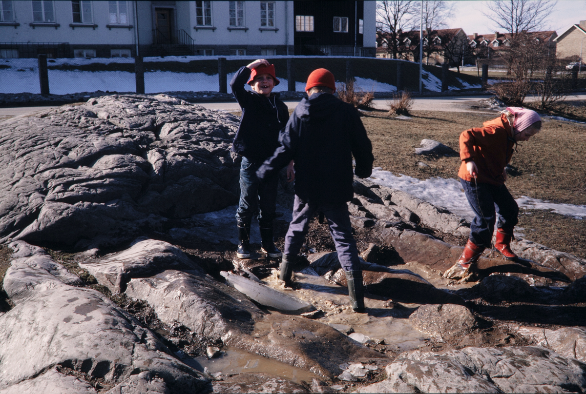 Lekande barn trampar is vid Ulriksbergskolan i Växjö, 1971.