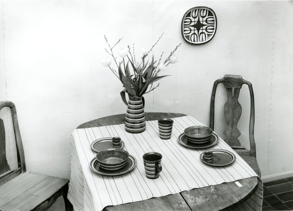 Uppdukat bord med keramik från Bo Fajans, utställning på Gefle Museum 24/4 - 4/5 1956.