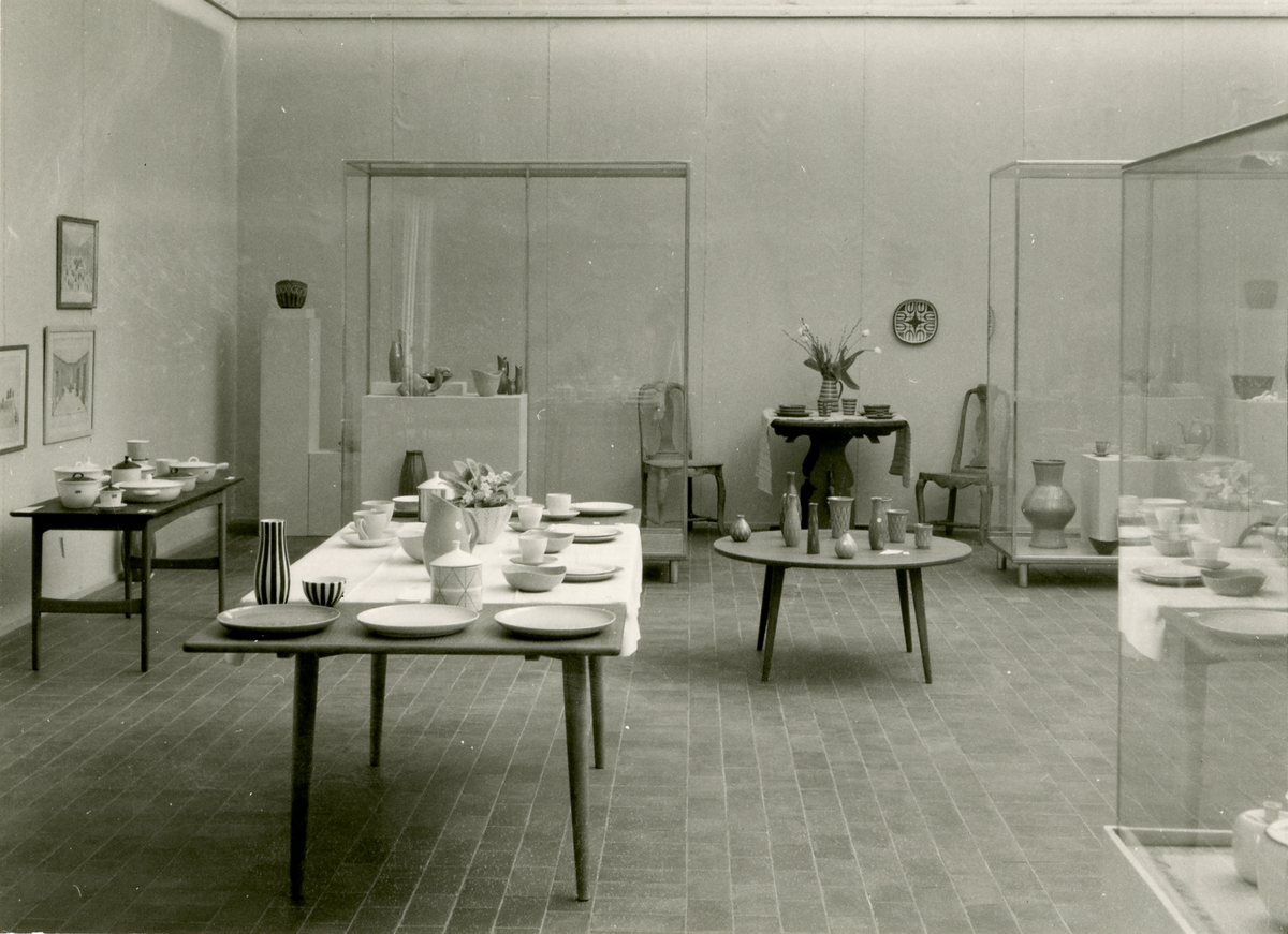 Utställningshallen med keramik från Bo Fajans, Gefle Museum 24/4 - 4/5 1956. Till vänster i bild skymtas tavlor av Josabeth Sjöberg.