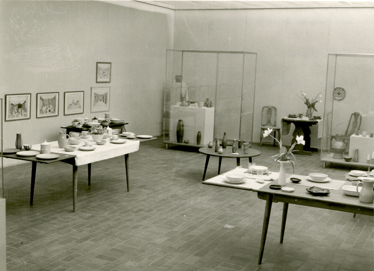 Utställningshallen med keramik från Bo Fajans, Gefle Museum 24/4 - 4/5 1956. På väggen hänger tavlor av Josabeth Sjöberg.