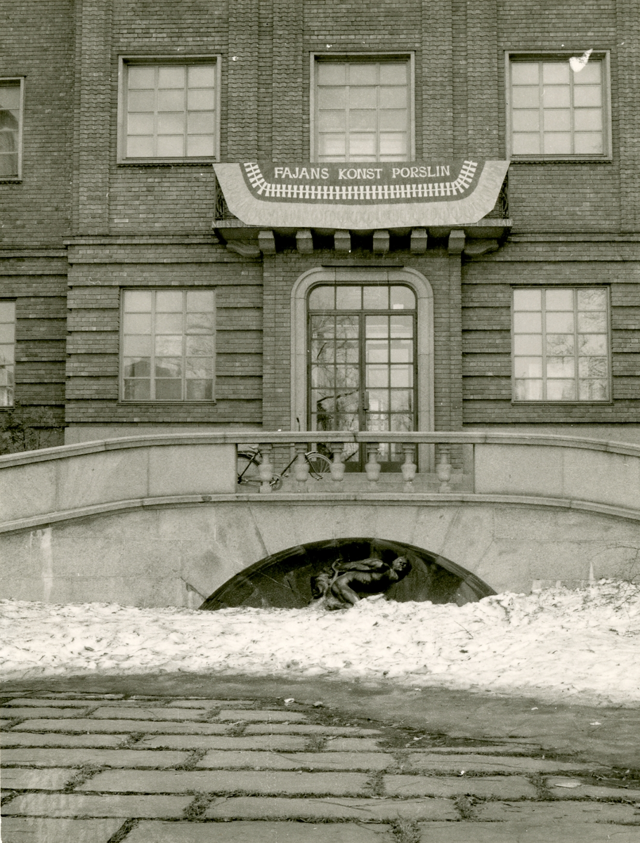 Stora entrén till Gefle Museum med banderoll för utställning av keramik från Bo Fajans, 24/4 - 4/5 1956. På bilden syns även bronsstatyn "Lokes Straff" av Ida Matton på sin ursprungliga plats (där idag den tillgängliga entrén finns).
