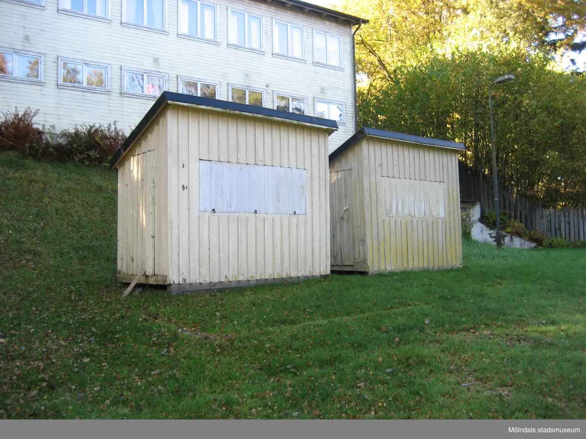 Två små ljusgula igenbommade ekonomibyggnader (kiosker) tillhörande Hällesåkers dansbana år 2010. De står på en gräsmatta. I bakgrunden ses en större byggnad.