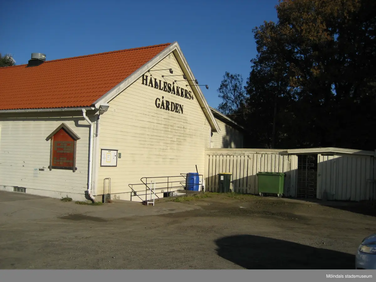 Hörnet av den ljusgula Hällesåkersgården år 2010. På gavelns övre del står textat med versaler HÄLLESÅKERSGÅRDEN. Till höger ses ett staket med en rotationsgrind.