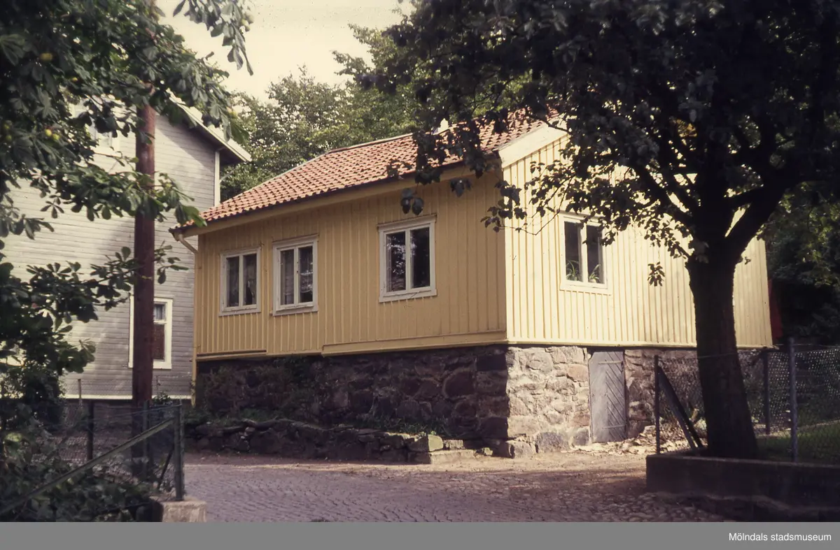 Ett ljusgult trähus på stensatt grund, Roten K 30 på Royens gata 11 1970-tal. Framför byggnaden finns en stenlagd yta. Till vänster ses den ljusgråa tvåvåningsbyggnaden Roten K 29 på Royens gata 9.