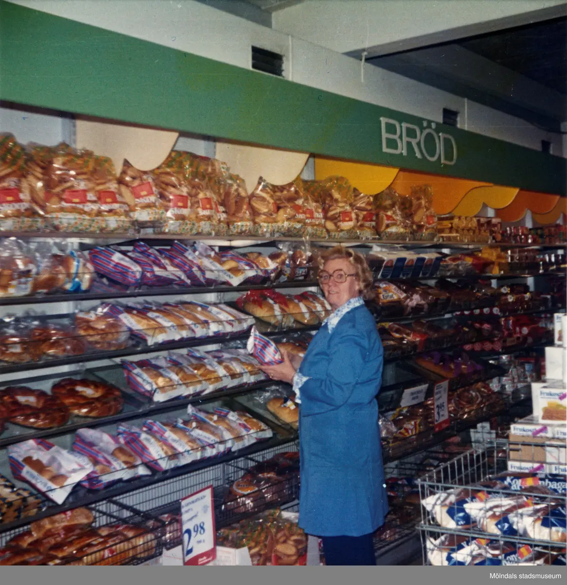En kvinnlig expedit, klädd i blå rock, står vid en vägg med uppsatta brödhyllor fyllda av olika slags bröd och kaffebröd, Domus Nya Torget 1970-tal. Ovanför hyllorna finns en lång grön skylt med texten "BRÖD".