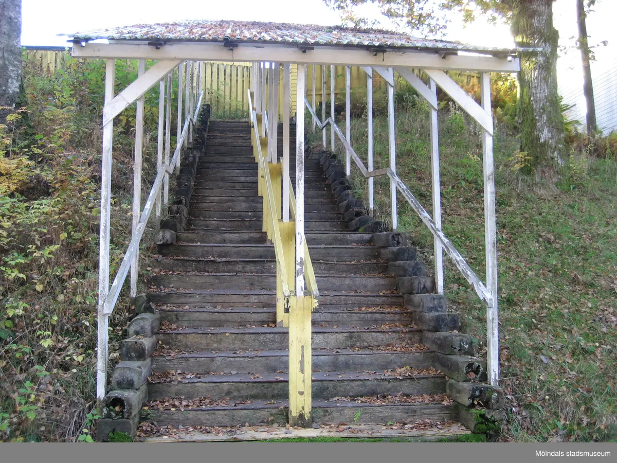En sluttande fristående trappa med tak, sedd framifrån, där människor kan köa till alternativt lämna Hällesåkers dansbana år 2010. Området är omgivet av växtlighet samt är inhägnat med staket.