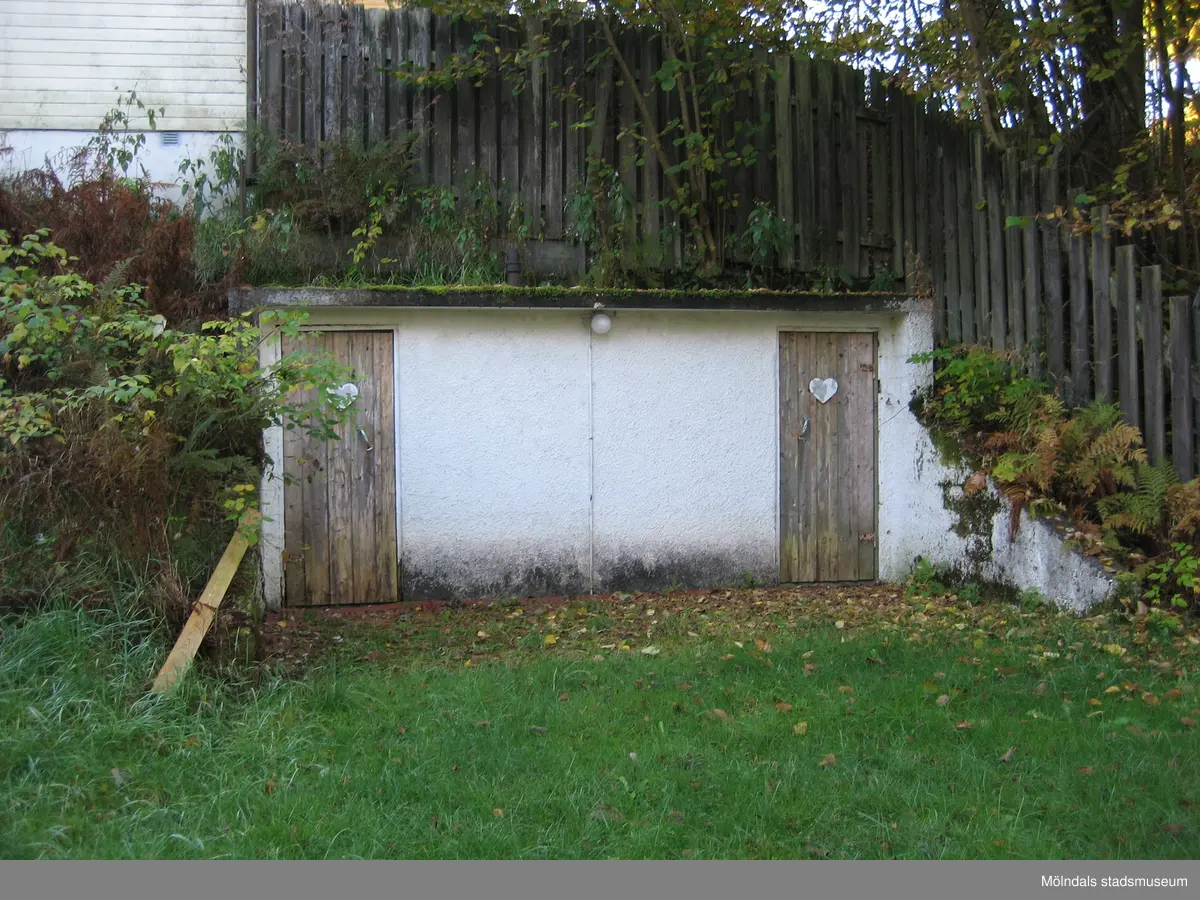 Två utomhustoaletter tillhörande Hällesåkers dansbana år 2010. På dörrarna finns var sitt trä-hjärta. Toaletterna är omgivna av växtlighet och placerade på en gräsmatta intill ett högt staket. I bakgrunden ses en del av en större byggnad.