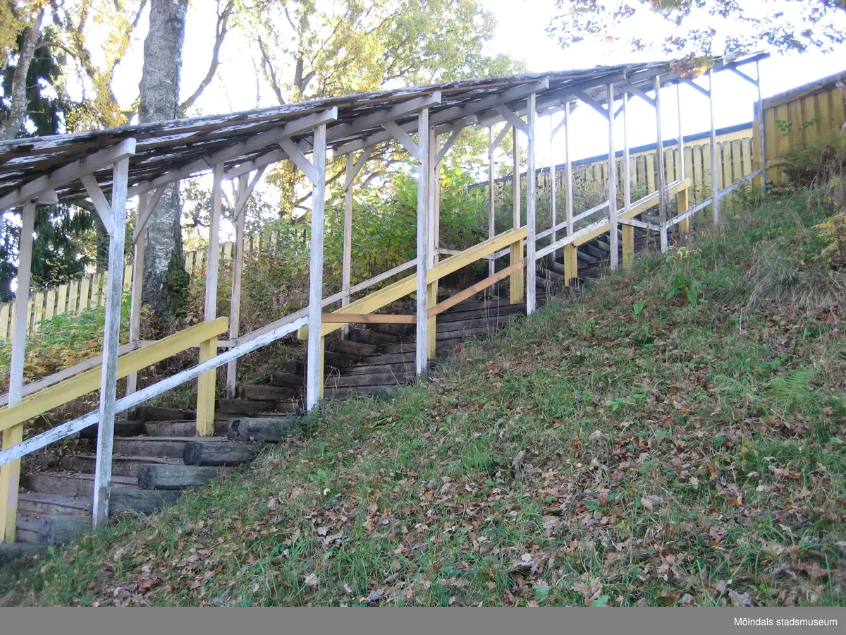 En sluttande fristående trappa med tak, sedd från höger, där människor kan köa till alternativt lämna Hällesåkers dansbana år 2010. Området är omgivet av växtlighet samt är inhägnat med staket.