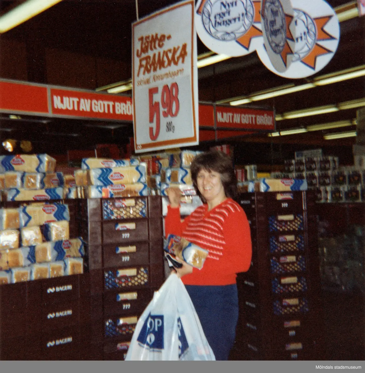 En kvinnlig kund står vid bröd-avdelningen och håller ett paket jättefranska samt på plastpåsar från Coop i handen, Domus Mölndal 1970-tal. På golvet står staplade bruna plastbackar fyllda med bröd. Ovanför backarna finns en skylt med texten "NJUT AV GOTT BRÖD!". Lite till vänster ovanför kunden hänger en textad skylt "JätteFRANSKA 5,98 800 g".