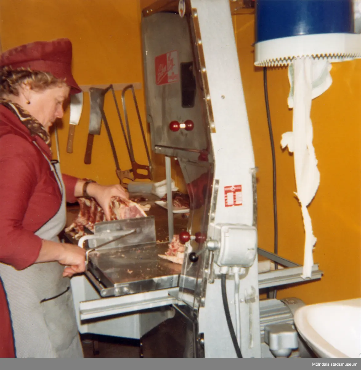 En kvinna står i ett orangefärgat inplastat rum avsett för styckning av kött. Hon står vid en stor skärmaskin och skär ett stort köttstycke i bitar. På väggen i bakgrunden hänger olika typer av knivar och sågar. Närmast till höger ses ett handfat och torkpapper, Domus Mölndals Centrum 1970-tal.