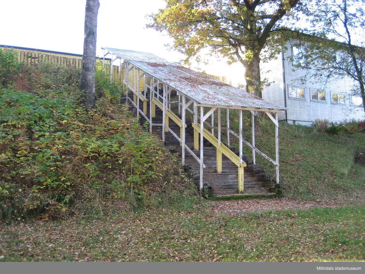 En sluttande fristående trappa med tak, sedd från vänster, där människor kan köa till alternativt lämna Hällesåkers dansbana år 2010. Till höger ses en vit byggnad. Området är omgivet av växtlighet samt är inhägnat med staket.