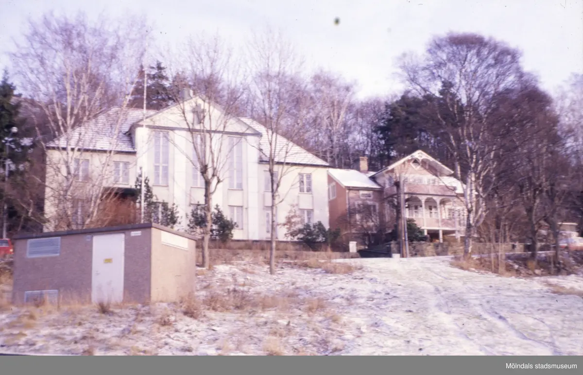 I förgrunden till vänster ses ett elskåp. Rakt fram ligger Svenska Missionskyrkan på Störtfjällsgatan 130 (tidigare: Trädgårdsgatan), 1970-tal. Till höger ses ett gult bostadshus på Störtfjällsgatan 128 (Fjärdingsmannen 1). På marken ligger ett tunt lager av snö.