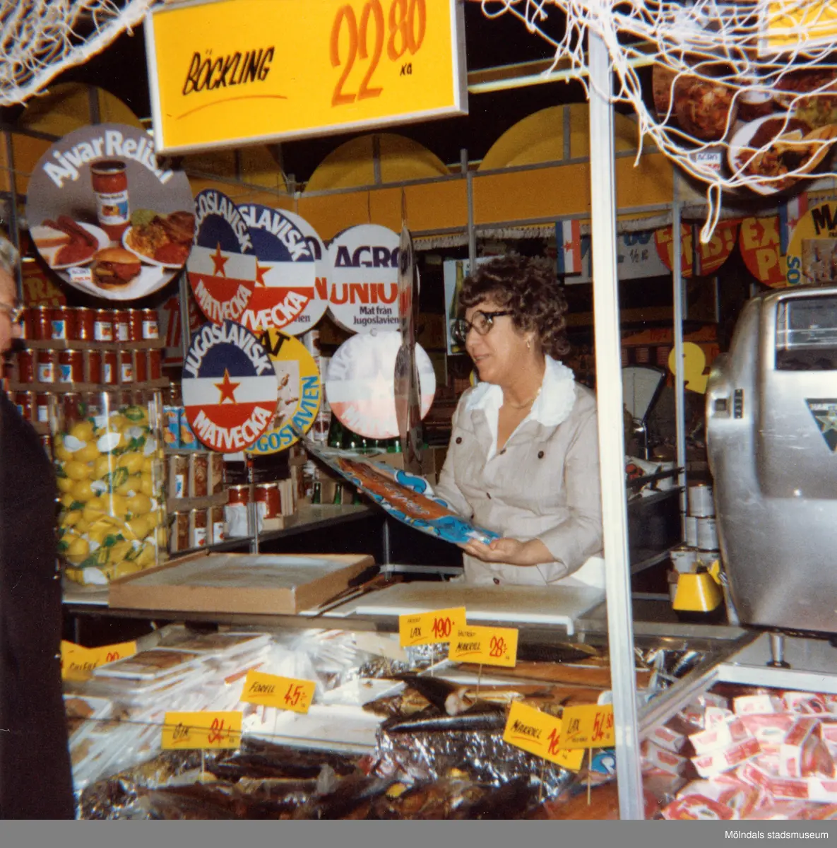En kvinnlig expedit står bakom fiskdisken och håller en stor inplastad fisk i handen. Hon pratar med en kund. Framför henne finns en kyldisk fylld med fisk- och skaldjursförpackningar. På hyllorna till vänster står staplade Ajvar-burkar och i en glas-skål finns konserverade förpackningar med pressad citron. Till höger ses en våg. I taket hänger runda pappers-skyltar med texterna "JUGOSLAVISK MATVECKA", "AjvarRelish" samt "AGRO UNION Mat från Jugoslavien". I mitten, längst upp i taket hänger ett vitt fisknät samt en gul skylt med texten "BÖCKLING 22,80 kg". Domus Mölndal 1970-tal.