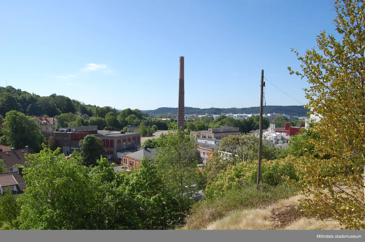 Vy från Störtfjället över Papyrus/Soabs industribyggnader och skorsten år 2010, efter att företaget hade lagts ner. Till vänster ses Mölndals kvarnby och i fonden skymtar AstraZeneca.