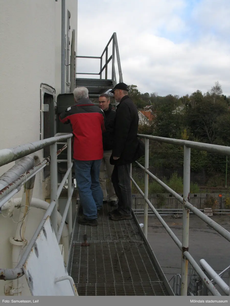 Tre män på en plattform intill silobyggnaden vid Soabs industrianläggning i Mölndals Kvarnby, år 2007. Anläggningen användes vid fototillfället av Hexion Speciality Chemicals Sweden AB.