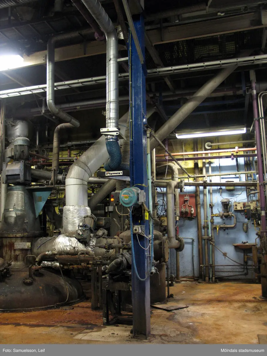 Rum med maskiner och rör. Interiörfotografi från byggnad vid Soabs industrianläggning i Mölndals Kvarnby, år 2007. Anläggningen användes vid fototillfället av Hexion Speciality Chemicals Sweden AB.