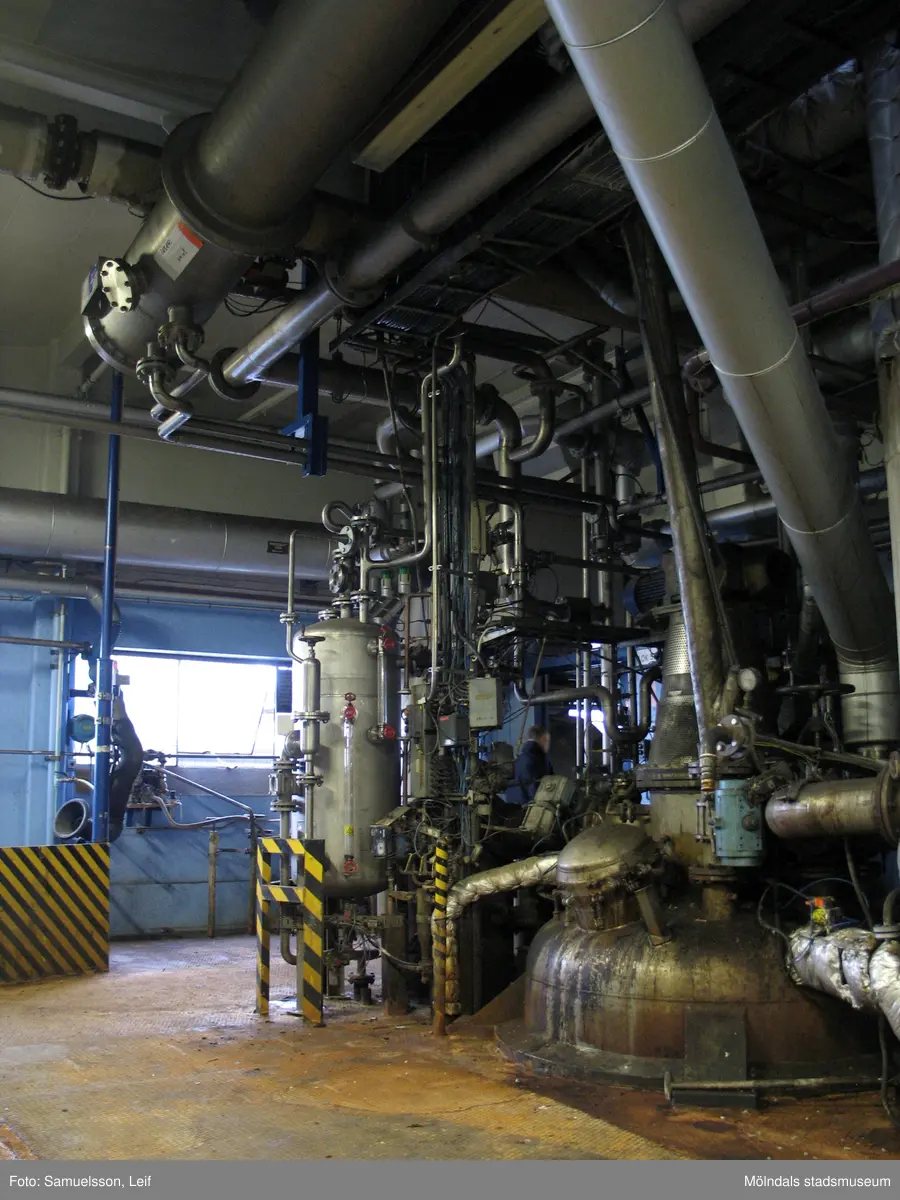 Rum med maskiner och rör. Interiörfotografi från byggnad vid Soabs industrianläggning i Mölndals Kvarnby, år 2007. Anläggningen användes vid fototillfället av Hexion Speciality Chemicals Sweden AB.
