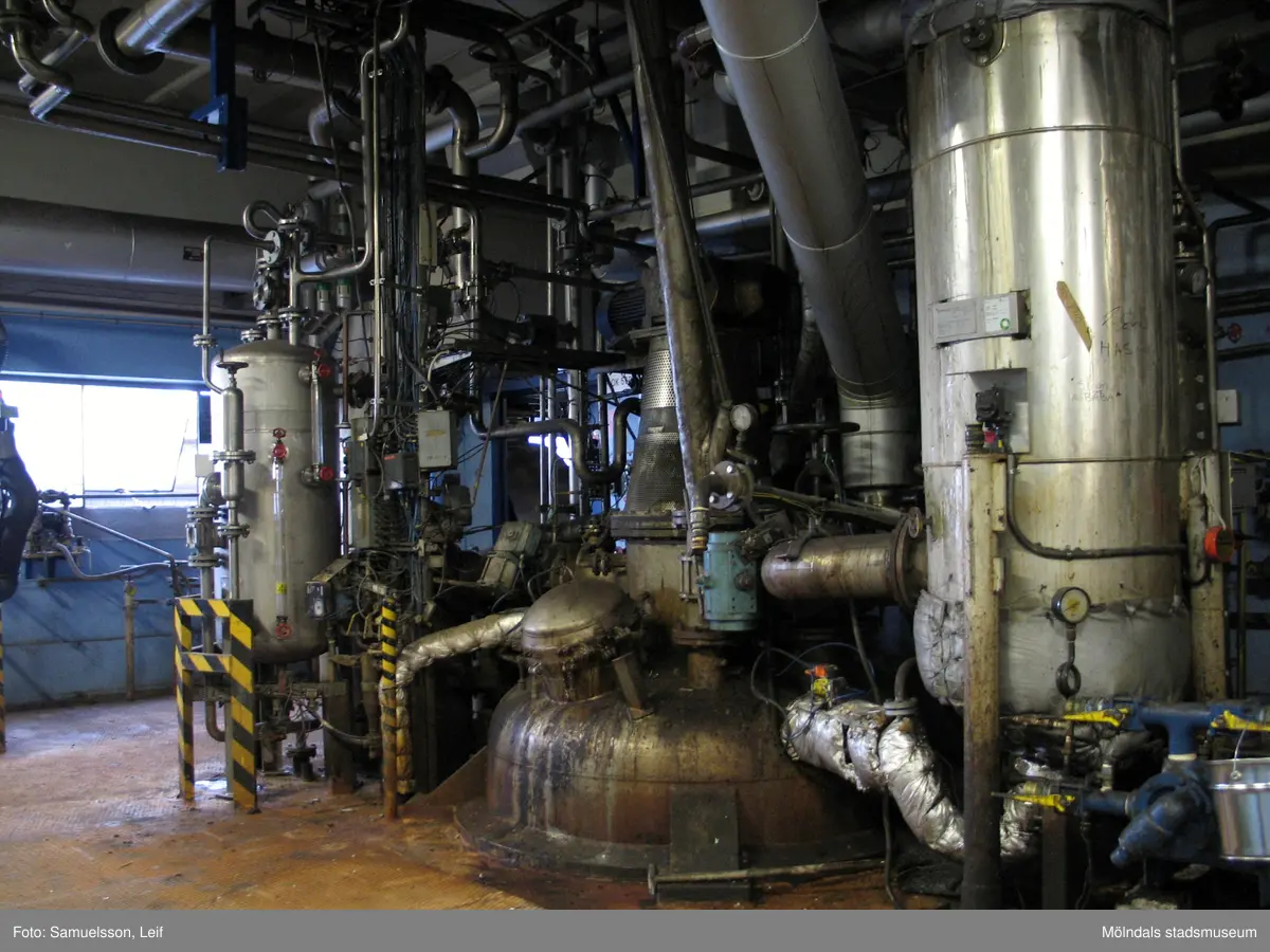 Rum med maskiner och rör. Interiörfotografi från byggnad vid Soabs industrianläggning i Mölndals Kvarnby, år 2007. Anläggningen användes vid fototillfället av Hexion Speciality Chemicals Sweden AB.