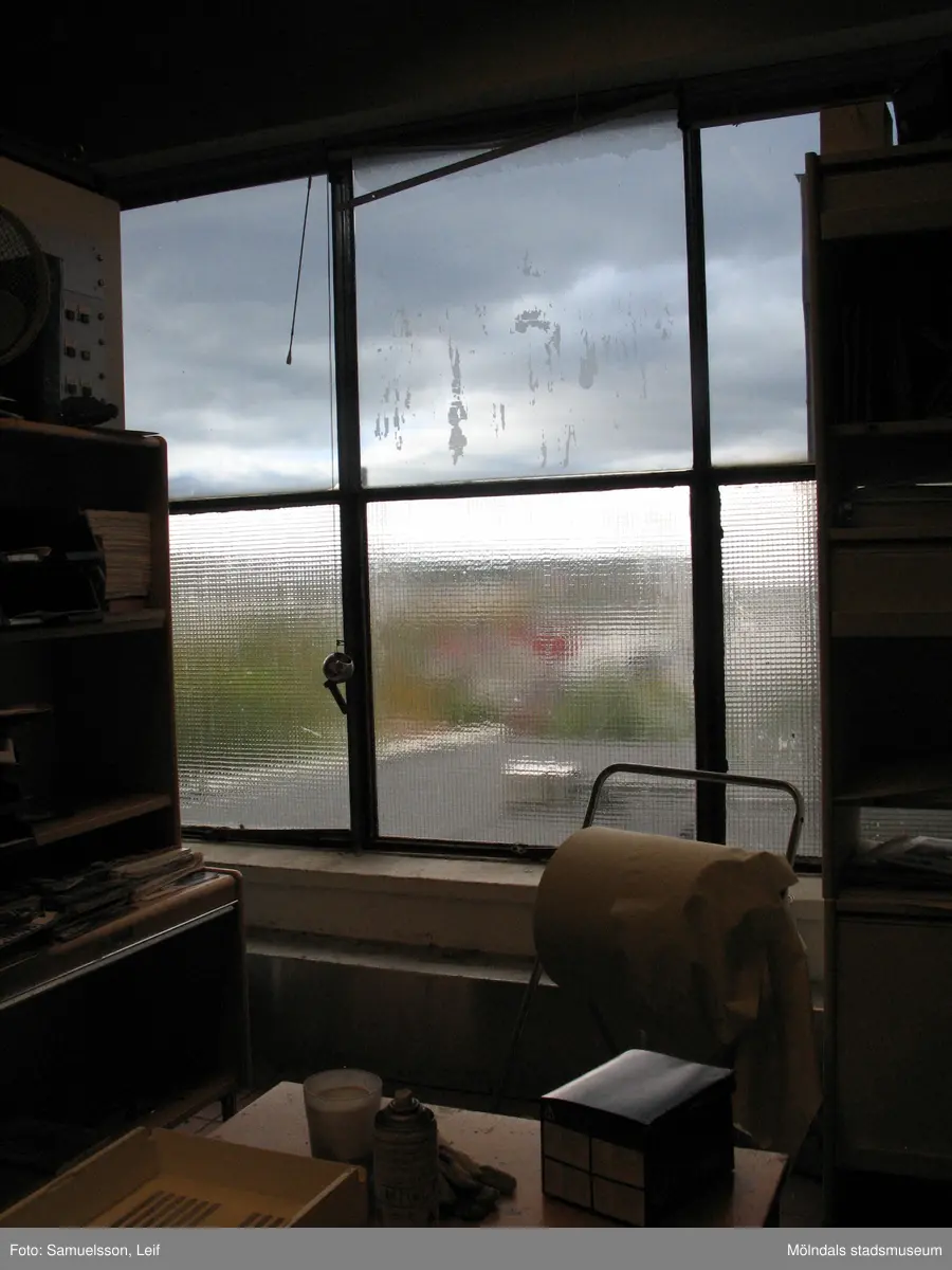 Rum med ett fönster, ett bord samt en pappersrulle. Interiörfotografi från byggnad vid Soabs industrianläggning i Mölndals Kvarnby, år 2007. Anläggningen användes vid fototillfället av Hexion Speciality Chemicals Sweden AB.