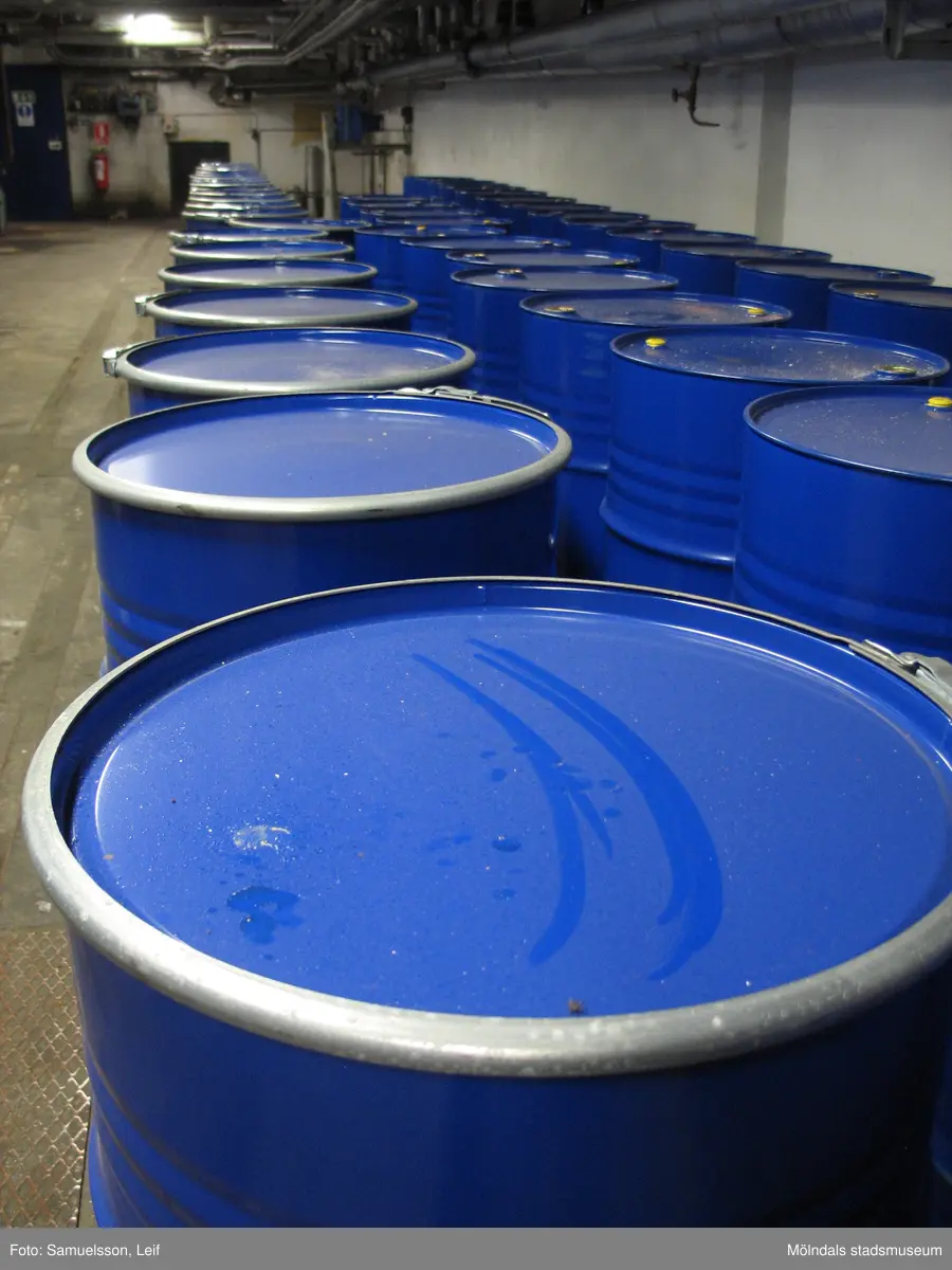 Industrilokal med ett flertal blå tunnor ståendes på golvet. Interiörfotografi från byggnad vid Soabs industrianläggning i Mölndals Kvarnby, år 2007. Anläggningen användes vid fototillfället av Hexion Speciality Chemicals Sweden AB.