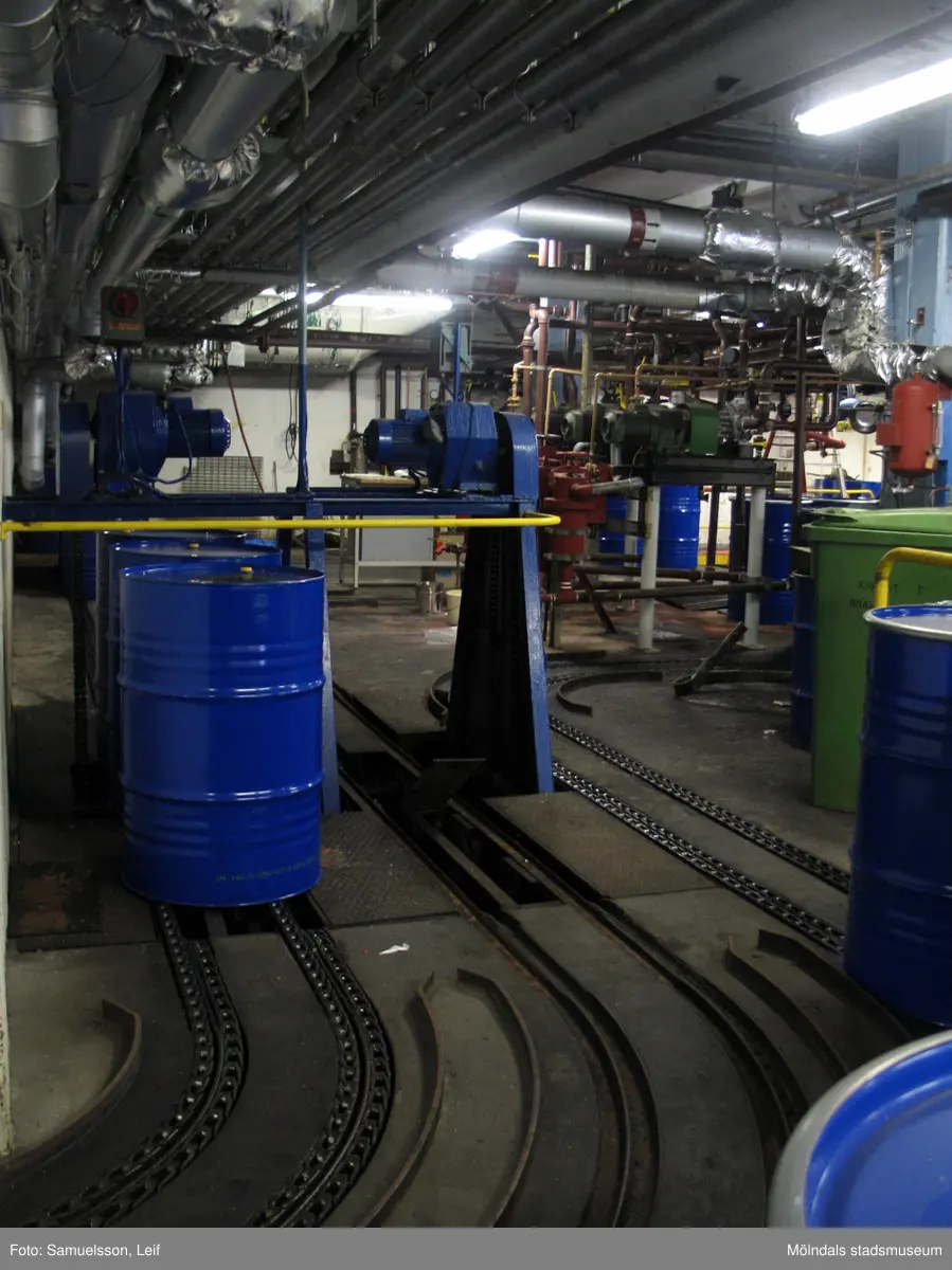 Industrilokal med transportanordning för tunnor i golvet. Interiörfotografi från byggnad vid Soabs industrianläggning i Mölndals Kvarnby, år 2007. Anläggningen användes vid fototillfället av Hexion Speciality Chemicals Sweden AB.