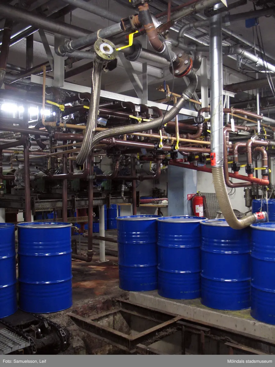 Industrilokal med ett flertal rörledningar. En samling blå tunnor står på golvet. Interiörfotografi från byggnad vid Soabs industrianläggning i Mölndals Kvarnby, år 2007. Anläggningen användes vid fototillfället av Hexion Speciality Chemicals Sweden AB.
