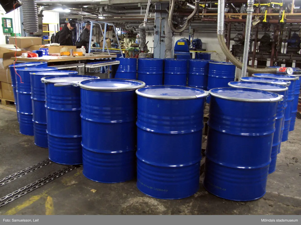Industrilokal med ett flertal rörledningar. En samling blå tunnor står på golvet. Interiörfotografi från byggnad vid Soabs industrianläggning i Mölndals Kvarnby, år 2007. Anläggningen användes vid fototillfället av Hexion Speciality Chemicals Sweden AB.