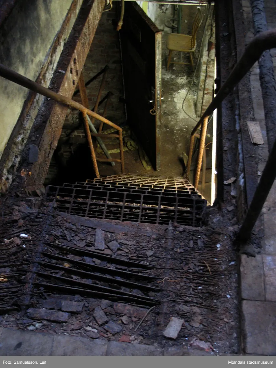 En trappa, fotograferad uppifrån. Interiörfotografi från byggnad vid Soabs industrianläggning i Mölndals Kvarnby, år 2007. Anläggningen användes vid fototillfället av Hexion Speciality Chemicals Sweden AB.