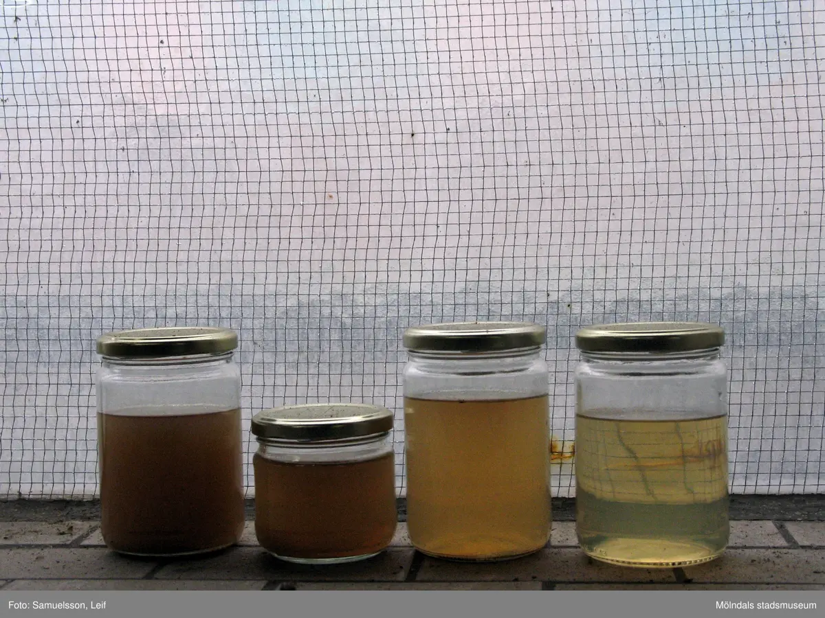 Fyra glasburkar, fyllda med flytande innehåll, står vid ett fönster. Interiörfotografi från byggnad vid Soabs industrianläggning i Mölndals Kvarnby, år 2007. Anläggningen användes vid fototillfället av Hexion Speciality Chemicals Sweden AB.