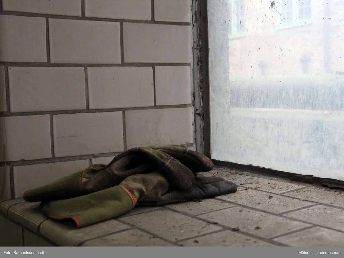 Ett par arbetshandskar ligger vid ett fönster. Interiörfotografi från byggnad vid Soabs industrianläggning i Mölndals Kvarnby, år 2007. Anläggningen användes vid fototillfället av Hexion Speciality Chemicals Sweden AB.