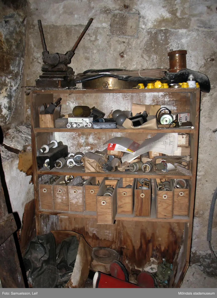 Utrymme med en hylla full med föremål. Interiörfotografi från byggnad vid Soabs industrianläggning i Mölndals Kvarnby, år 2007. Anläggningen användes vid fototillfället av Hexion Speciality Chemicals Sweden AB.