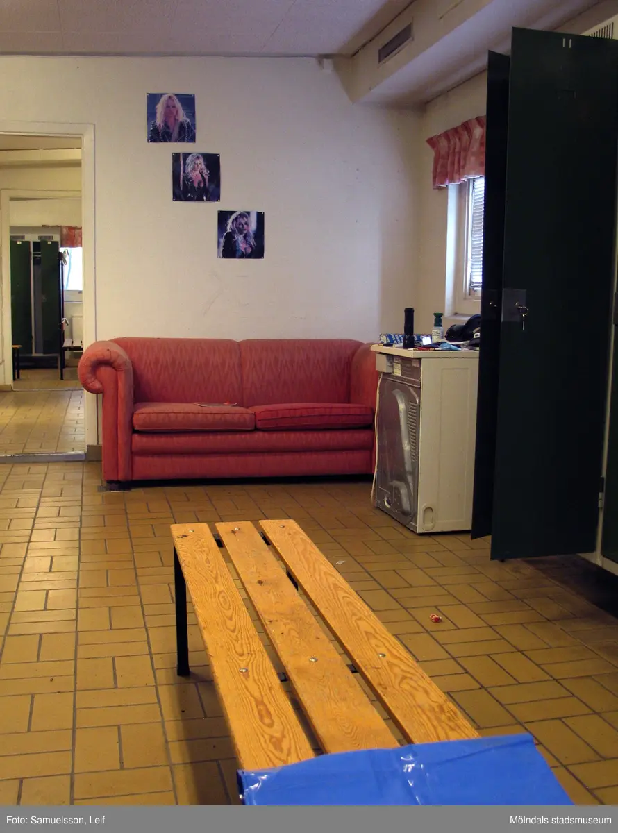 Omklädningsrum med skåp, en bänk samt en soffa. Interiörfotografi från byggnad vid Soabs industrianläggning i Mölndals Kvarnby, år 2007. Anläggningen användes vid fototillfället av Hexion Speciality Chemicals Sweden AB.