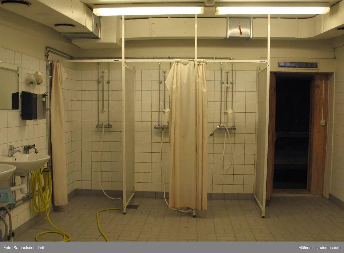 Duschrum med tre duschar. Interiörfotografi från byggnad vid Soabs industrianläggning i Mölndals Kvarnby, år 2007. Anläggningen användes vid fototillfället av Hexion Speciality Chemicals Sweden AB.
