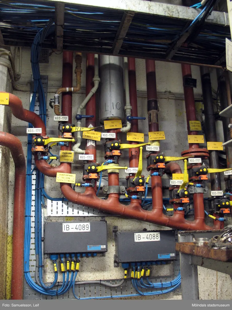 El- och rörledningar intill en vägg. Interiörfotografi från byggnad vid Soabs industrianläggning i Mölndals Kvarnby, år 2007. Anläggningen användes vid fototillfället av Hexion Speciality Chemicals Sweden AB.