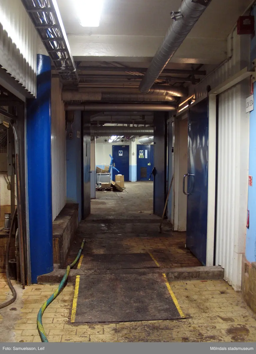 En gång med blåmålade dörrar på båda sidor. Interiörfotografi från byggnad vid Soabs industrianläggning i Mölndals Kvarnby, år 2007. Anläggningen användes vid fototillfället av Hexion Speciality Chemicals Sweden AB.