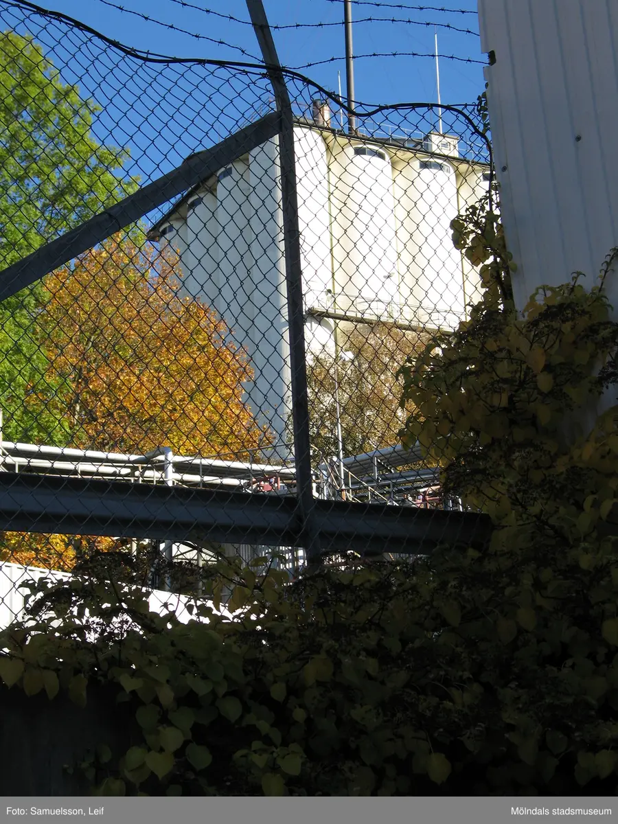 Vy genom ett stängsel mot silobyggnaden vid Soabs industrianläggning i Mölndals Kvarnby, år 2007. Anläggningen användes vid fototillfället av Hexion Speciality Chemicals Sweden AB.