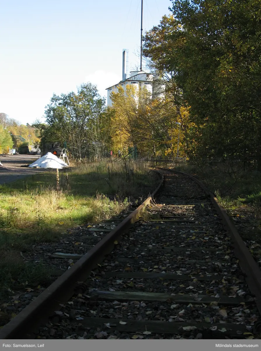 Järnvägsspår vid Soabs industrianläggning i Mölndals Kvarnby, år 2007. I bakgrunden skymtas silobyggnaden bakom träden. Anläggningen användes vid fototillfället av Hexion Speciality Chemicals Sweden AB.