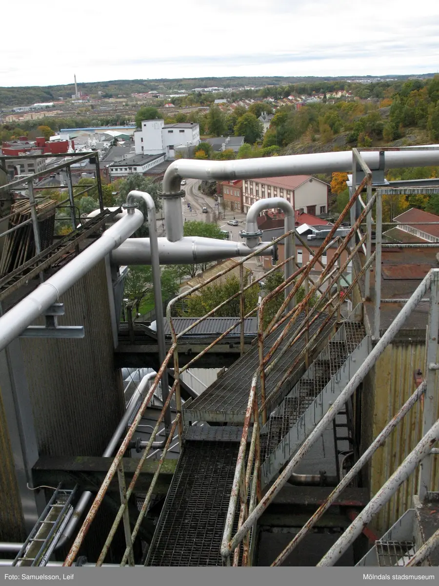 Byggnad vid Soabs industrianläggning i Mölndals Kvarnby, år 2007. Plattform med trappor, räcken och rörledningar. I bakgrunden ses även byggnader vid Gamla torget samt vid pappersbruket Papyrus. Anläggningen användes vid fototillfället av Hexion Speciality Chemicals Sweden AB.