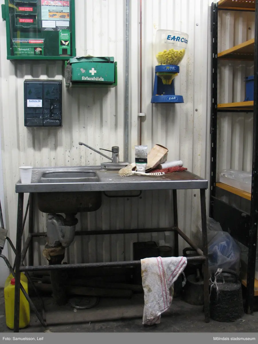 En diskbänk står intill en vägg. På väggen sitter förbandsmaterial och en förpackning med öronproppar. Interiörfotografi från byggnad vid Soabs industrianläggning i Mölndals Kvarnby, år 2007. Anläggningen användes vid fototillfället av Hexion Speciality Chemicals Sweden AB.